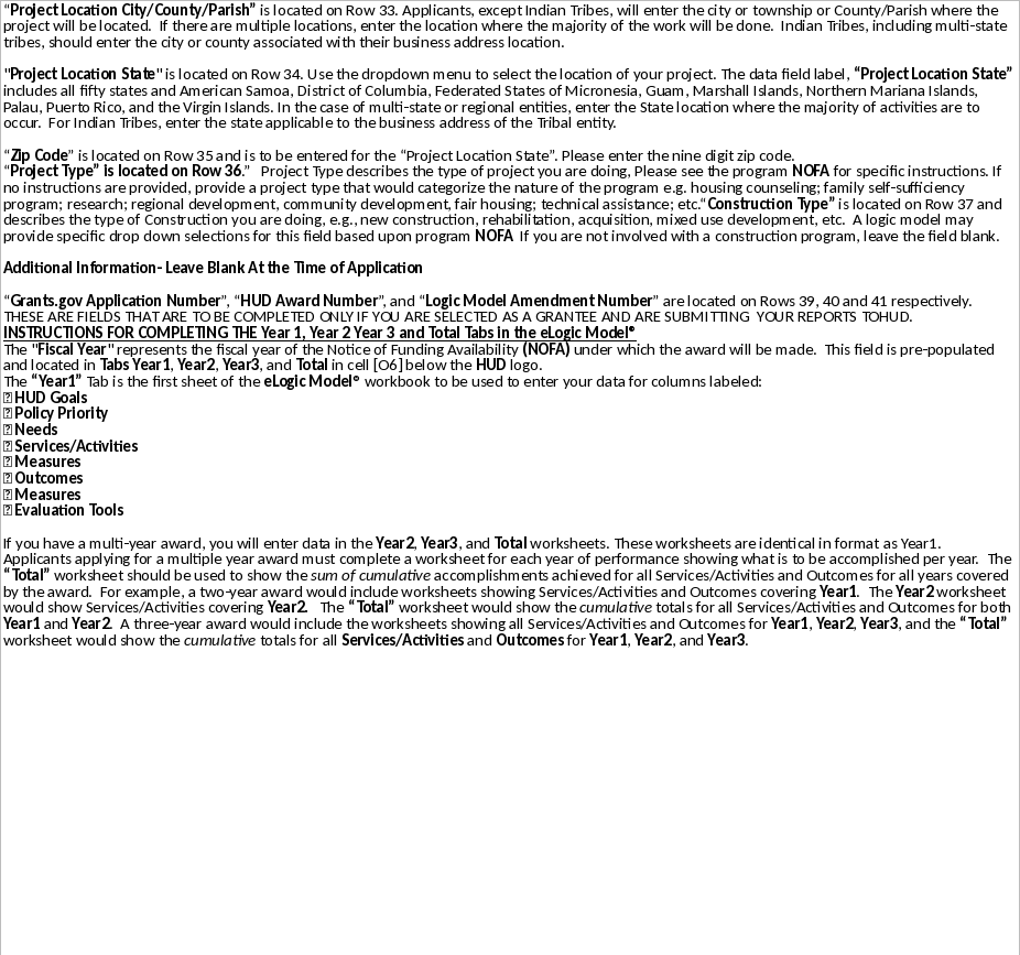 When completing this section there are "mandatory" fields that must be completed. These fields are highlighted in yellow. The required data must be entered correctly to complete an eLogic Model®. After completing all mandatory fields on the coversheet click on the “Check Errors” button at the top of this page. Applicant Legal Name must match box 8a in the SF-424 in your application. Enter the legal name by which you are incorporated and pay taxes. CCR Doing Business is new for 2010 eLogic Model®. Only complete this field if your registration at CCR includes an entry in Doing Business as: (dba). Enter the DUNS # as entered into box 8c of the SF-424 Application for Federal Assistance form. Enter the City where your organization is located, this information must match the SF-424 data in your application. Use the dropdown to enter the State where your organization is located, this information must match the SF-424 data in your application. This information must match the SF-424 data in your application. Enter the Grantee Contact Name and email address in the field provided. Enter the name of the person that completed the eLogic Model® and their email address in the field provided. When completing the Project Information Section, applicants except Indian Tribes must enter their Project Name, Project Location City/County/Parish, State, Project Type, and Construction Type. If there are multiple locations, enter the location where the majority of the work will be done. Indian tribes, including multi-state tribes, should enter the City or County associated with their business address location. For Indian Tribes, enter the state applicable to the business address of the Tribal entity. |
