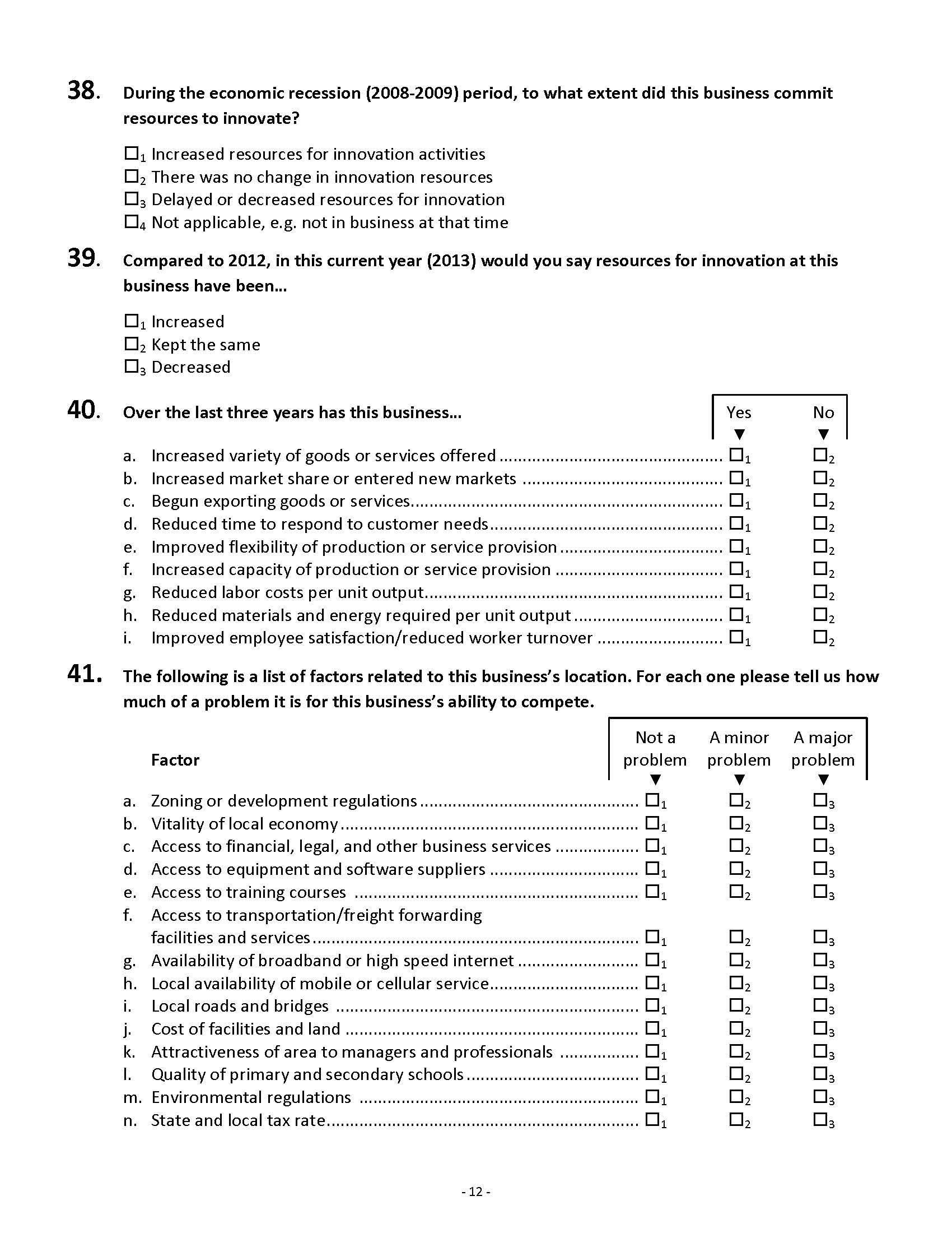 The attempt to define an equivalent to production workers in manufacturing by defining “workforce” as all workers excluding managers and professionals is not appropriate for many service-producing industries. The definition of “workforce” is dropped. Q9 now asks about average wages of non-salaried workers regardless of occupation type. Q10 now asks about the occupational composition of the business and Q10a asks about the minimum educational requirement by OMB occupational group. This will provide better information that should be easier to answer as the response is now regarding qualities by well-defined class of employee rather than qualities of a potentially ambiguous single group of employees.