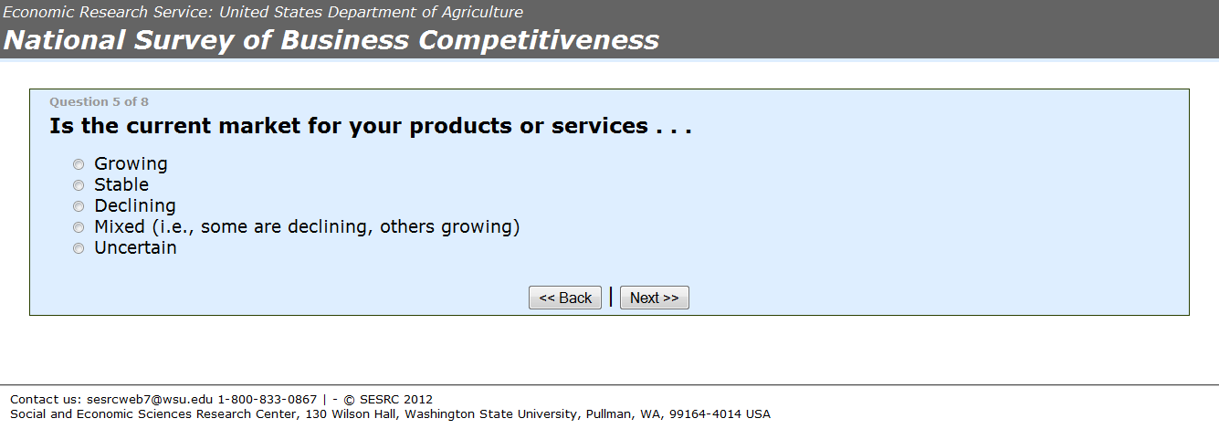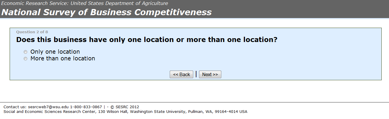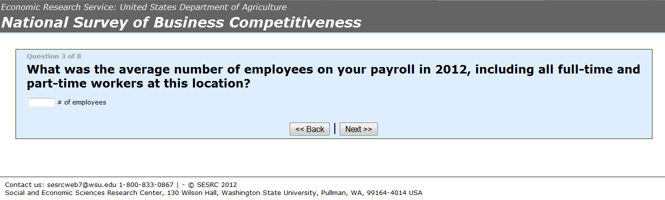 YOUR RESPONSE IS VOLUNTARY. YOUR ANSWERS TO ALL QUESTIONS ARE CONFIDENTIAL. All information that is provided by participants to the National Survey of Business Competitiveness will only be used for statistical research purposes and reported in summary form. Your name and that of the business you represent will not be connected to your answers in any way. In accordance with the Confidential Information Protection provisions of Title V, Subtitle A, Public Law 107-347 and other applicable Federal laws, individual responses will be kept confidential and will not be disclosed in identifiable form to anyone outside of the research team. By law, every ERS and SESRC employee is subject to a jail term of up to 5 years, a fine of up to $250,000 or both if he/she discloses any identifiable information about research participants
