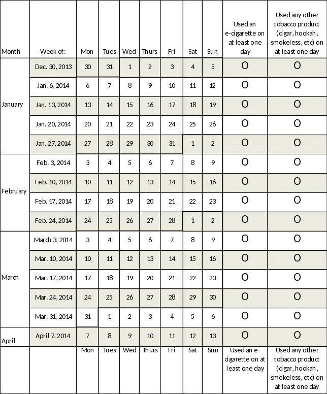 NC1e. A continuación, nos gustaría obtener más detalles sobre su hábito de fumar, su uso de cigarrillos electrónicos y su uso de cualquier otro producto de tabaco semanalmente durante los últimos 4 meses. Para cada semana que se lista a continuación, por favor indique si dejó de fumar por completo por lo menos un día porque estaba tratando de dejar de fumar, si usó un cigarrillo electrónico o usó cualquier otro producto de tabaco, tal como puros, pipa “hookah” o productos de tabaco sin humo.