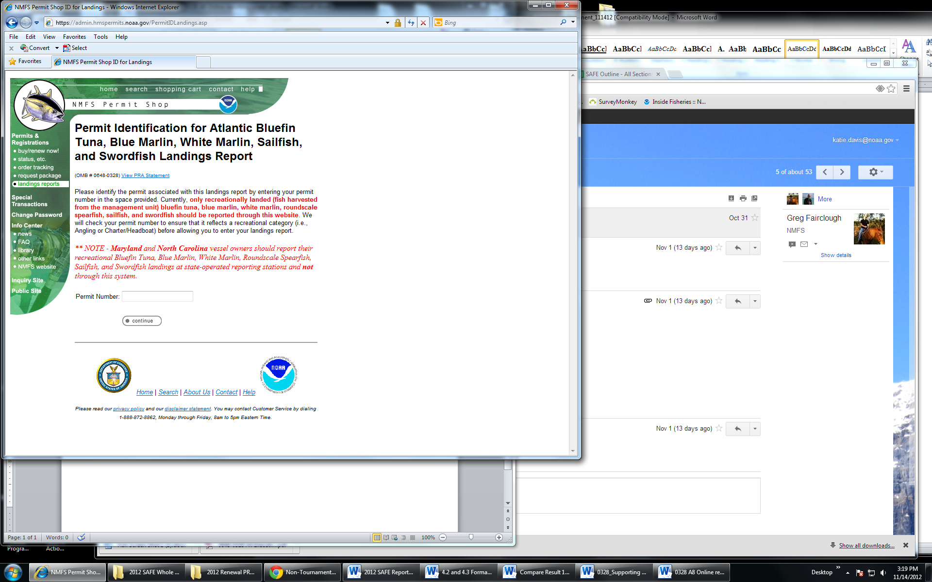 PAPERWORK REDUCTION ACT STATEMENT: Collection of information through annual permitting serves three purposes: (1) it provides current information on the vessel owners participating in the Atlantic HMS and tuna fisheries. (2) it provides an up-to-date sampling frame that is the basis for fleet size calculations used for catch and effort estimates in fisheries that do not require mandatory reporting, thus enabling the U.S. to meet international obligations to report catch statistics for Atlantic tunas, and (3) aids NMFS in the enforcement of fishery regulations. Public reporting burden for this initial permit application of information is estimated to average 30 minutes per response, including time for reviewing instructions, searching existing data sources, gathering and maintaining data needed, and completed & reviewing the collection of information. Permit renewals are accomplished by using an automated phone system at (888) 872-8862 or by accessing the web site at www.nmfspermits.com. Public reporting burden for renewal by telephone or web is estimated to average 6 minutes per response. Send comments regarding this burden estimate or any other aspect of this collection of information, including suggestions for reducing this burden to: National Marine Fisheries Service, F/SF1, 1315 East West Highway, Silver Spring, MD 20910. Providing the requested information in the permit application is mandatory for managing the Atlantic HMS and tuna fisheries in accordance with the Atlantic Tunas Convention Act (16 U.S.C. 971 et seq.) and the Magnuson-Stevens Fishery Conservation and Management Act (Magnuson-Stevens Act). It is agency policy not to release confidential information, other than in aggregate form, as the Magnuson-Stevens Act protects (in perpetuity) the confidentiality of those submitting information. Summaries of permit information by category may be released. Notwithstanding any other provision of the law, no person is required to respond to, nor shall any person be subject to a penalty for failure to comply with a collection of information subject to the requirements of the Paperwork Reduction Act, unless that collection of information displays a currently valid OMB Control Number. This is an approved information collection under OMB #0648-0327 and expires July 31, 2015.