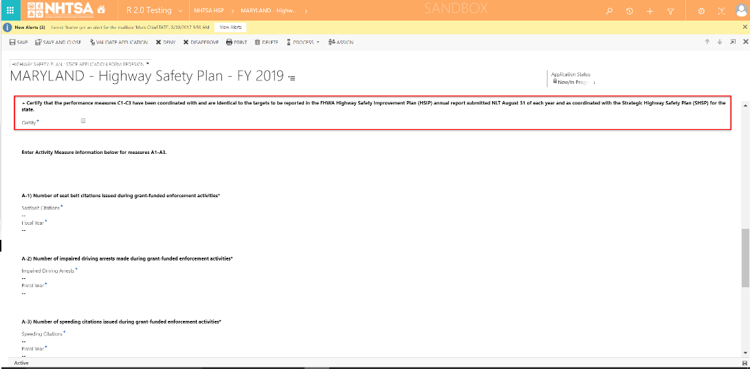 | 4 | All State Users | Scroll down and verify that the State can certify the following by checking the checkbox: Certify that the performance measures C1-C3 have been coordinated with and are identical to the targets to be reported in the FHWA Highway Safety Improvement Plan (HSIP) annual report submitted NLT August 31 of each year and as coordinated with the Strategic Highway Safety Plan (SHSP) for the state. |