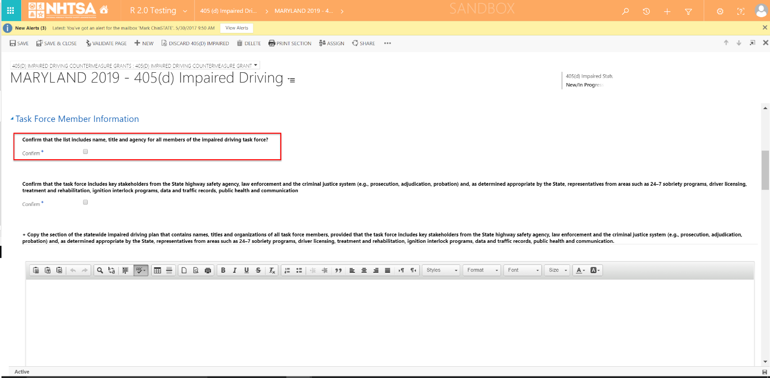 | 7 | All State users | Check the Confirm box under Confirm that the task force includes key stakeholders from the State highway safety agency, law enforcement and the criminal justice system (e.g., prosecution, adjudication, probation) and, as determined appropriate by the State, representatives from areas such as 24–7 sobriety programs, driver licensing, treatment and rehabilitation, ignition interlock programs, data and traffic records, public health and communication. |
