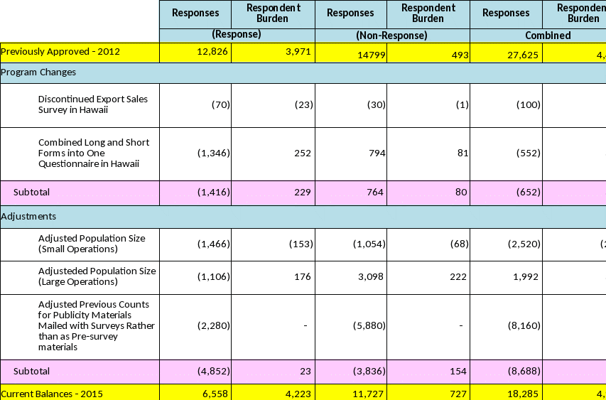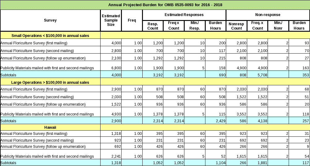 There is a reduction in the number of respondents which results in an adjustment in the sample sizes and number of responses. With changes in the floriculture industry, many smaller operations have either gone out of business or have merged with other operations; as a result there is a decrease in the estimated number of operations. In the previous submission the publicity materials were mailed out with the questionnaires and not as a pre-survey contact. Therefore there is an adjustment in the number of responses. There is a slight increase in respondent burden due to an adjustment. In the previous submission we omitted the burden that was associated with the attempt to collect data from the larger operations by mail before beginning the phone and field enumeration.