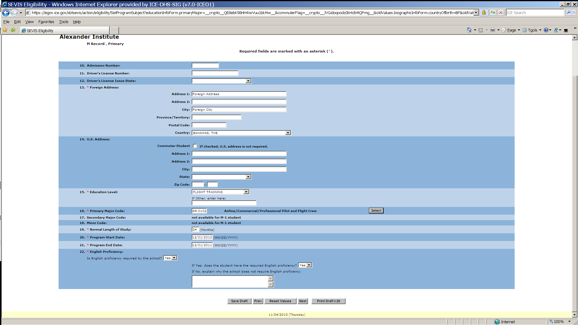 M-1 student arrives at school. The designated school official enters registration information. Includes current session, next session start date, and U.S. address.