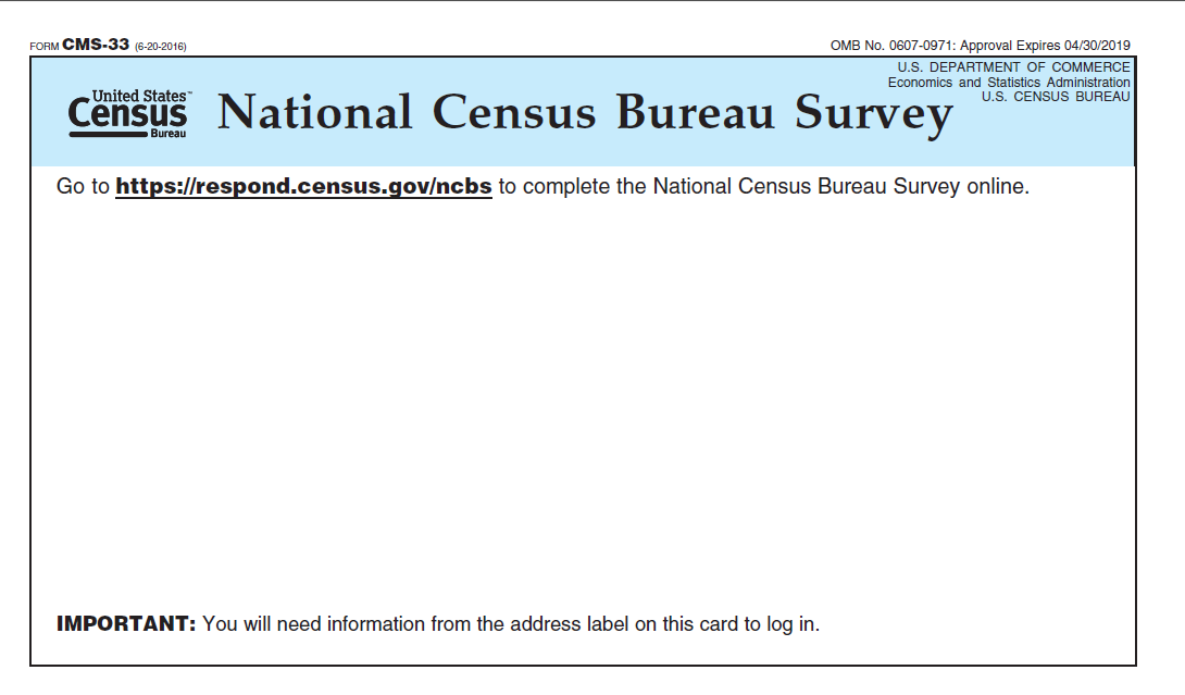 Use the enclosed instruction card to complete the survey online at: https://respond.census.gov/ncbs |