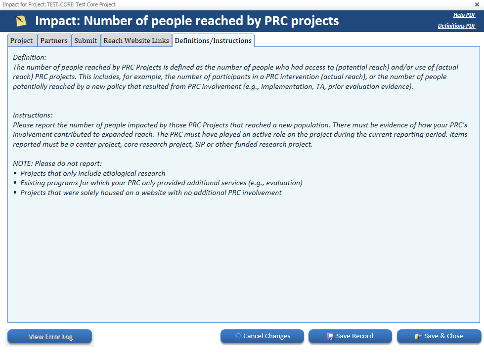 Center project details – Definitions/Instructions tab |