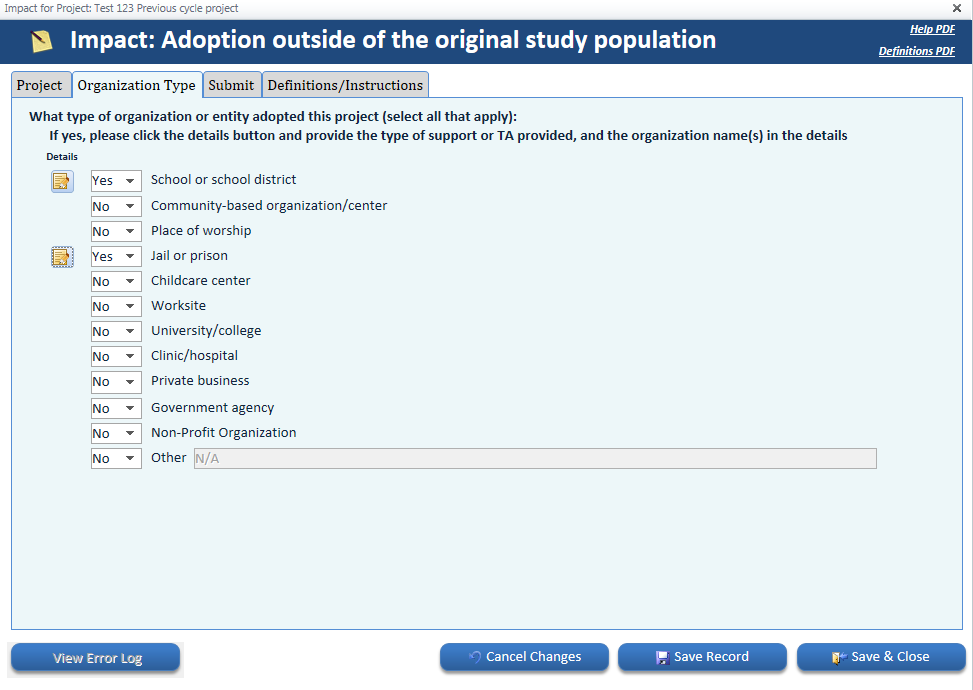 Project adoption outside details – Definitions/Instructions tab |