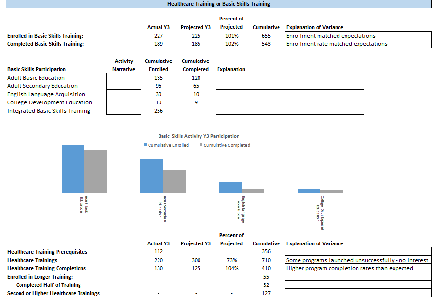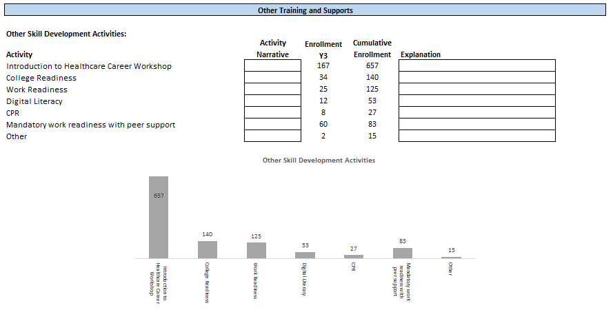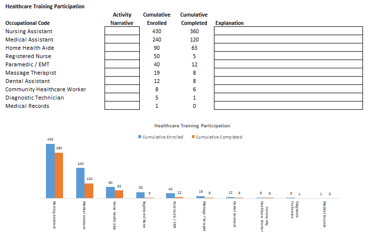Below is the complete list of the proposed data items from HPOG Next Gen Participant Accomplishment and Grant Evaluation System (PAGES) that will feed into the Performance Progress Reports (PPRs). The PPR will consist of two sections within the PAGES system—a narrative portion that grantees will fill out in PAGES each six-month period, and a quantitative portion that will include metrics automatically generated from data that has been entered elsewhere in PAGES. The narrative portion will be taken directly from the first four pages of ACF-OGM-SF-PPR (a standard ACF form already approved by OMB under number 0970-0406; included in this attachment) and embedded in PAGES. The quantitative section will use the data items listed below. We also present a mockup of the quantitative section of the PPR.