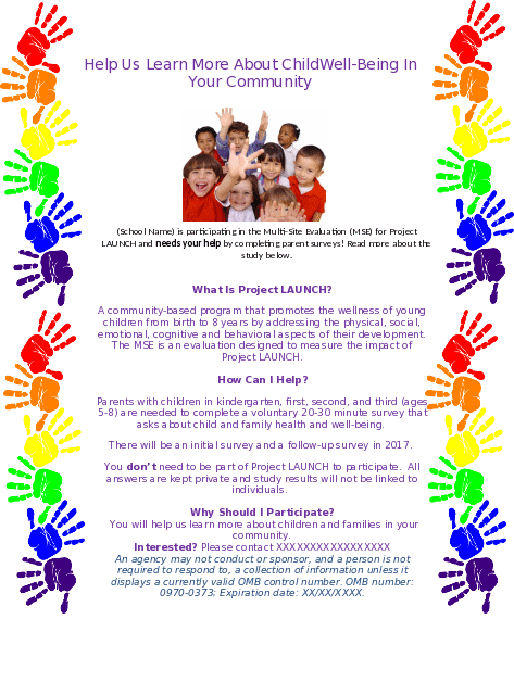 Hello my name is ____________, and I am calling about the Project LAUNCH Multi-Site Evaluation, which is being conducted by the Substance Abuse and Mental Health Services Administration and the Administration for Children and Families at the U.S. Department of Health and Human Services. An agency may not conduct or sponsor, and a person is not required to respond to, a collection of information unless it displays a currently valid OMB control number. OMB number: 0970-0373; Expiration date: XX/XX/XXXX. OMB approval for this data request was received ___ under OMB number 0970-0373. The study is about healthy development and wellness in children from birth through 8 years old.