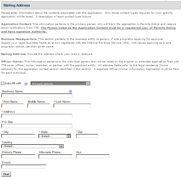 Mailing Address – This contact includes information about the address where you would like to receive mail from TTB.