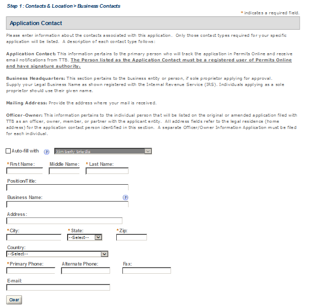 Application Contact - This contact is the primary person with whom TTB will discuss application information and who will receive email notifications from TTB about the submitted application. This may be a consultant or an owner, officer, or other employee representing the applicant company. We recommend at least one Owner or Officer be added as an Application Contact. See “Adding Additional Application Contacts.”
