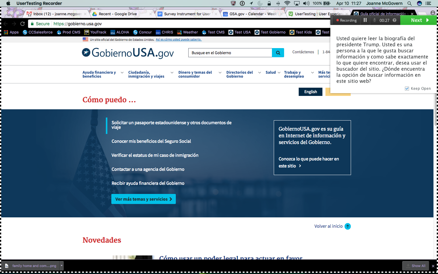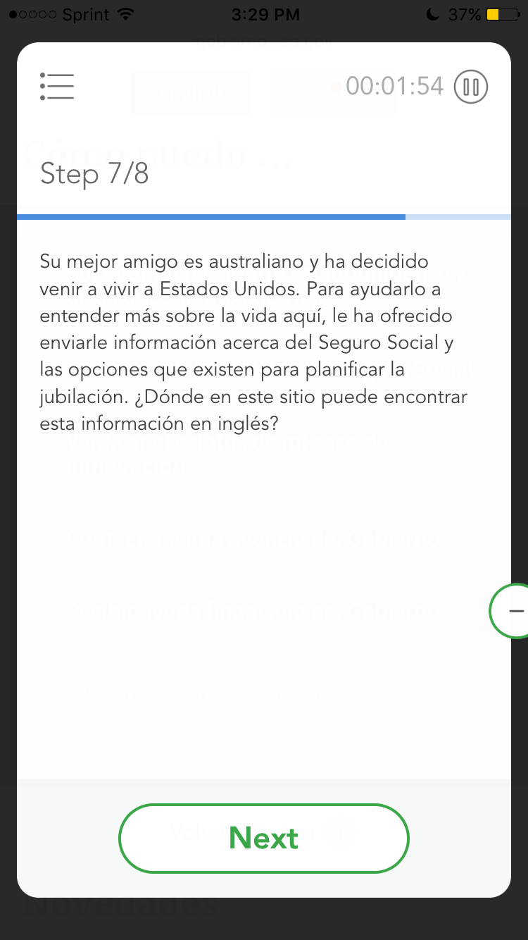 8. Baje el cursor hasta el pie de la página. Ahí verá un enlace que dice “Sobre GobiernoUSA.gov”. No haga click en este enlace, pero por favor díganos qué esperaría encontrar si lo hiciera.