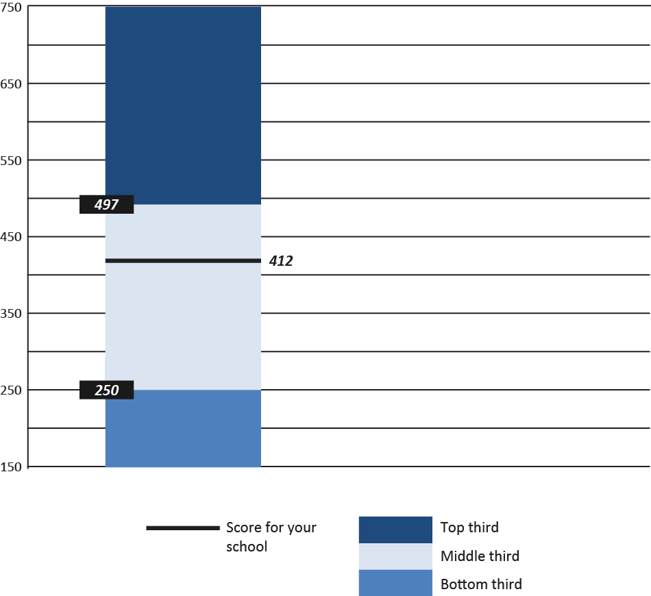 The EDSCLS national benchmark data will be made publically available through the second release of the EDSCLS platform in fall 2017. These national data will be included as the context for school scores. For example, figure 2 shows one possible way of showing tertiles based on the national data along with a school’s score. For more information, please see appendix E. We also plan to provide respondent-level subgroup reporting by grade (student only), sex, and race/ethnicity. If the number of respondents in some racial groups do not meet reporting standards, they will be collapsed into an “other” category.