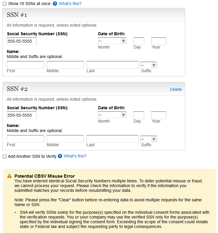 User fills in the SSN Verification fields. User may choose to enter them one at a time, or they may enter 10 at once.