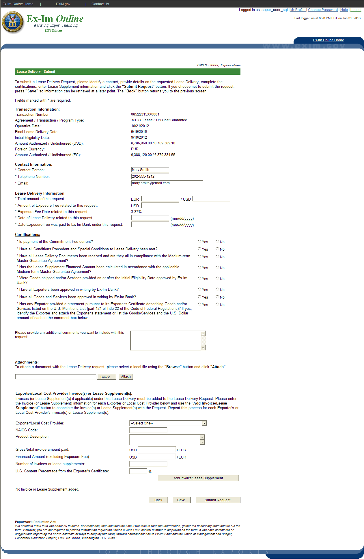 Ex-Im Bank has developed an electronic disbursement approval processing system for guaranteed lenders with transactions documented under Medium-term Master Guarantee Agreements. After an export transaction has been authorized by Ex-Im Bank and legal documentation has been completed, the lender will obtain and review the required disbursement documents (e.g. invoices, bills of lading, Exporter’s Certificates, etc.) and will disburse the proceeds of the loan for eligible goods and services. In order to obtain approval of the disbursement, the lender will access and complete an electronic questionnaire through ExIm Online. Ex-Im Bank’s action (approved or declined) will be posted on the lender’s history page.