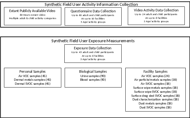 The exposure characterization study is a pilot-scale effort to: (a) collect information on human activity parameters for synthetic turf field users that affect potential exposures to tire crumb rubber constituents; and (b) implement a human exposure measurement study to further develop and deploy appropriate sample collection methods and to generate data for improved exposure characterization (summarized in Figure ES-2). This data collection will use questionnaires administered to adults and youth (or the parents of children) who use synthetic turf fields with tire crumb rubber infill. Information will be collected to provide data about relevant parameters for characterizing and modeling exposures associated with the use of synthetic turf fields. A subset of participants will have video data collection performed during a physical activity on a synthetic turf field. In addition, publicly available videography of users engaged in activities on synthetic fields will, if feasible, be acquired to provide objective assessment of contact rates and types that are difficult to capture consistently using questionnaires. A subset of participants providing questionnaire responses will also be asked to participate in an exposure measurement study. A set of personal, biological, and field environment samples will be collected around a sport or training activity performed on a synthetic turf field. Personal and environmental samples will be analyzed for metal, VOC, and SVOC analytes, and a subset of SVOC samples will undergo suspect screening and non-targeted analysis. Biological samples will be held for future analysis once potential biomarker chemicals of interest are identified based on the tire crumb rubber and exposure characterization studies.