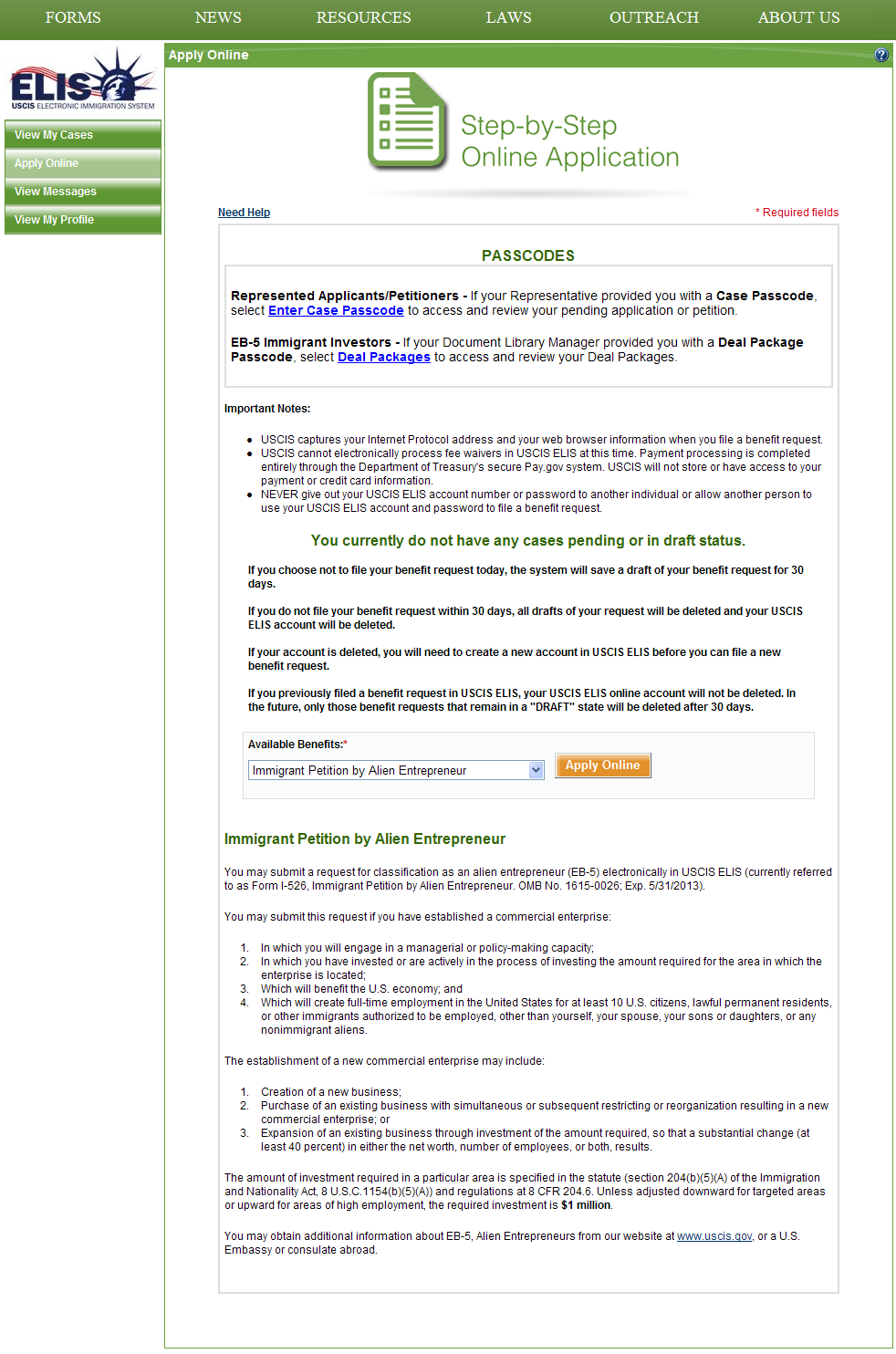 This is the second screen the applicant will see after the applicant logs into USCIS ELIS. On the first screen, the applicant selected “Alien Petition by Immigrant Investor.”