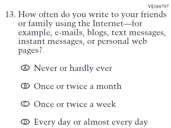 Sub-items were revised to consistently list plural items in parentheses. The response options were revised to those used in parallel 2016 Mathematics pilot items. Sub-items a and c were revised to provide simpler wording in place of "anthropologist" and "multimedia". |