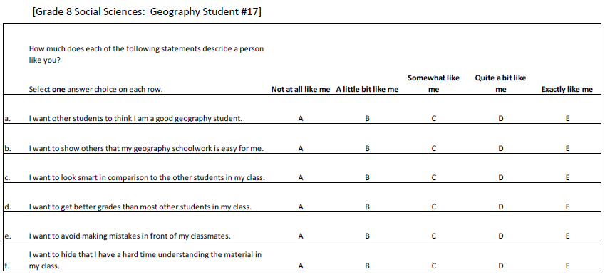 The stem wording was revised to specifically reference geography, while the subject reference was removed from sub-item c. Previous sub-item e (current d) was revised to replace the term “class” with “schoolwork.” |