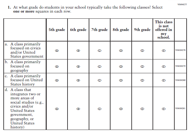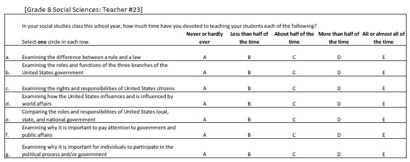 Based on cog lab responses, the item stem wording was revised to clearly refer to "civics and/or United States government." The response options were expanded to a multiple response format to account for non-mandated professional development. |