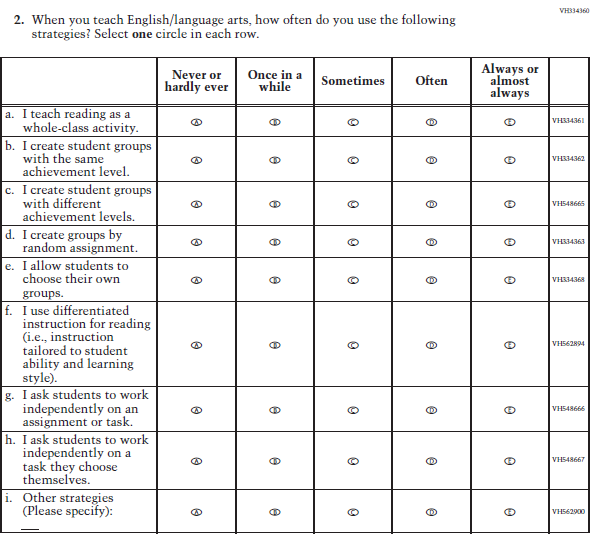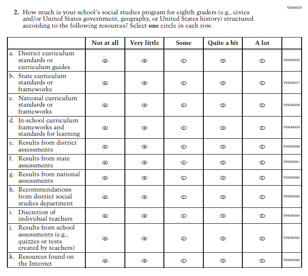 The stem and response options were revised to maintain consistency with a similar Civics instructional strategy item in teacher. "For example" was replaced with "e.g." for consistency with the abbreviation conventions used across all teacher and school questionnaires. Previous sub-item d (current c) and current sub-item i had revisions to wording for improved clarity. To achieve consistency with the revised wording of the parallel student item, current sub-items f and g were the result of disaggregation of the previous sub-item version. |