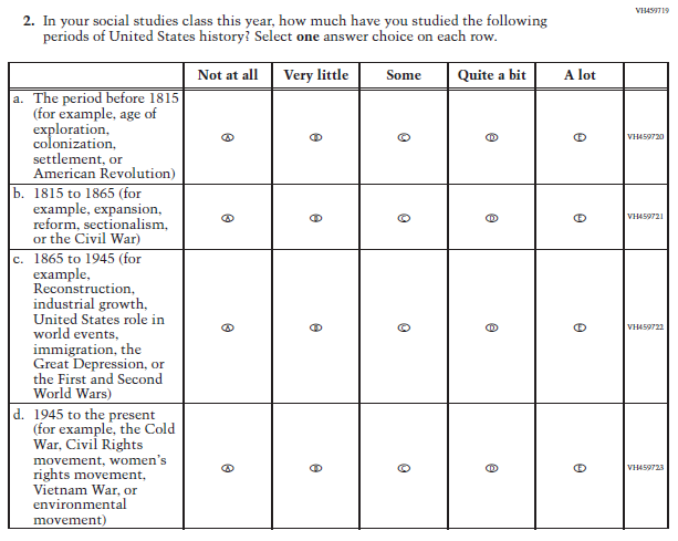 The response option "5th grade" was added to achieve consistency with similar items found in the Civics, Geography, and U.S. History student questionnaires. For sub-item a and d, the phrase "civics or United States government” was revised to "civics and/or United States government". The word "or" was added before "United States history" in sub-item f. |