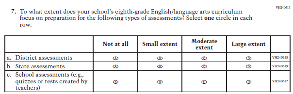 This request is to update the 2017-2019 NAEP clearance with the updated materials for 2017. Specifically, the final survey questions have been selected for 2017. The questions have been selected from those that appear in the “library” presented in Appendix F. In addition, some minor wording changes have been made to many of the items based on pilot and cognitive interview results and final reviews. All of the changes are non-substantive in nature. The table presented on the following pages indicates the items that have changed wording from the original version presented in Appendix F, as well as the rationale for the change. The final questionnaires to be administered are presented as a new package document, Appendix I. Note that some of the questionnaires will utilize spiraling in order to minimize respondent burden while maximizing the amount of items that can be piloted. The spiral maps for these questionnaires are also included in Appendix I.