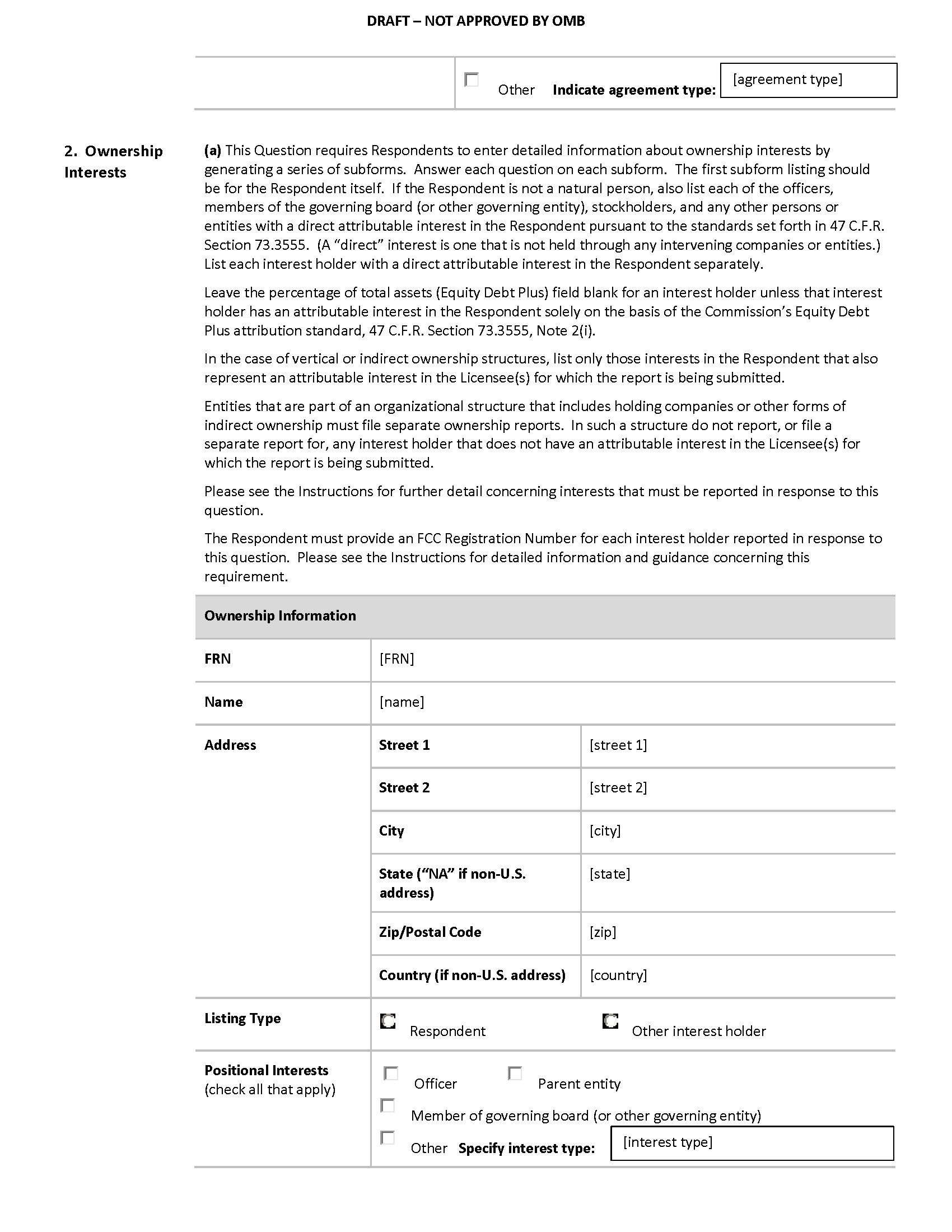 Question 2: Ownership Interests. As used in Question 2, an attributable interest is an ownership interest in or relationship to a Licensee that confers on its holder a certain degree of influence or control over the Licensee as defined in the Commission’s rules. For guidance concerning attributable interests, Respondents should consult the instructions below. In addition, Respondents should review the Commission’s attribution policies and standards, which are set forth in 47 C.F.R. Section 73.3555, as revised and explained in Review of the Commission’s Regulations Governing Attribution of Broadcast and Cable/MDS Interests, MM Docket No. 94-150, 14 FCC Rcd 12559 (1999), recon. granted in part, 16 FCC Rcd 1097 (2000) and Report and Order in MM Docket No. 83-46, 97 FCC 2d 997 (1984), recon. granted in part, 58 RR 2d 604 (1985), further modified on recon., 61 RR 2d 739 (1986). Finally, Respondents should consult Promoting Diversification of Ownership in the Broadcasting Services, MB Docket No. 07-294, Second Report and Order, and Order on Reconsideration, FCC 16-1, ¶¶ 47-50 (Jan. 20, 2016).