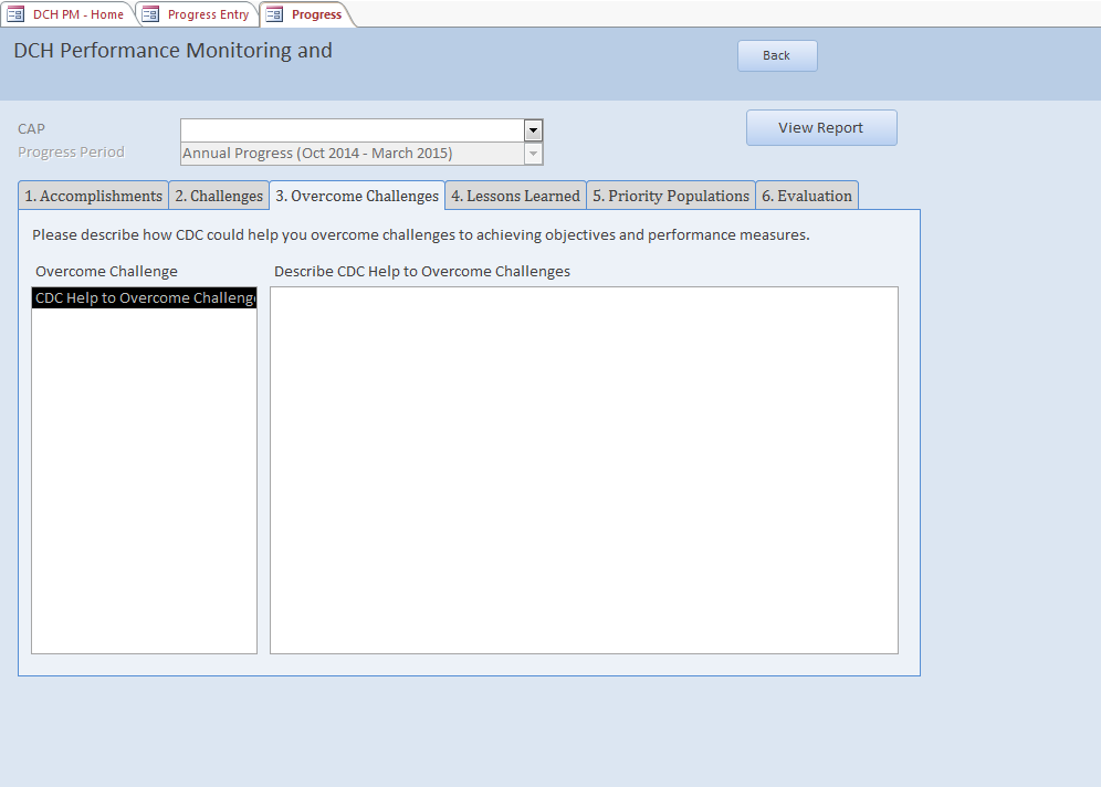 The DCH Performance Monitoring Database (DPMD) was developed by ICF to complement the Policy, Environmental, Programmatic, and Infrastructure Database (PEPID). It works in parallel with PEPID to assist PICH, REACH and National Organization awardees with developing their Community Action Plan (CAP), and it will allow them to track progress, process measures, outcome measures, and estimate the impact of their efforts to meet the requirements of the FOA.