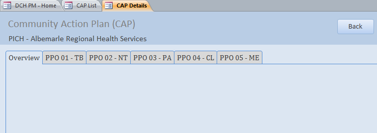 The Community Action Plan (CAP) section of the DPMD is where you will enter and edit information in your CAPs. It will contain information about your Project Period Objectives (PPOs), Annual Objectives (AOs) and Activities for each year of the award. PICH and REACH awardees that entered their Year One CAPs in the Excel CAP template and returned it to their Project Officer by the date indicated will have some or all of their Year One CAP pre-loaded into the DPMD. If your CAP is already in the DPMD, you should review the entries to ensure that they are correct and complete. You may need to edit or enter additional information. Once you have entered/confirmed the information contained in this section, you will be able to create a report that displays your complete Year One CAP.