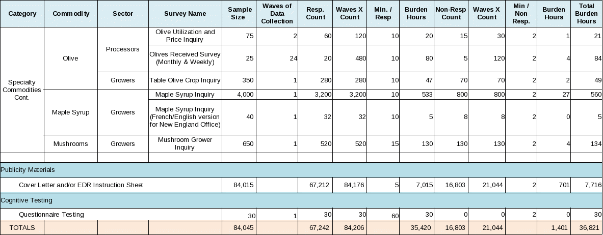 The new annual burden of 36,821 hours is up 18,463 hours above the previous inventory of 18,358 hours. The increase is a result of several miscellaneous program changes. NASS has entered into an agreement with the California Department of Food and Agriculture to conduct additional surveys for almonds, citrus, grapes, olives, prunes, and walnut producers to satisfy industry needs not covered by Federal Appropriations.