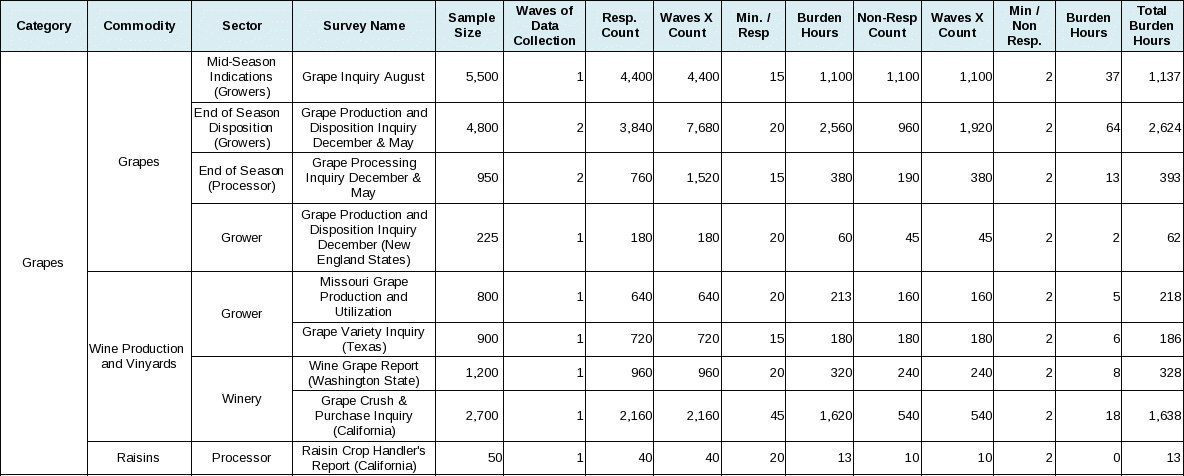 Additional burden is requested for Connecticut, Maine, Massachusetts, Missouri, New Hampshire, Rhode Island, Texas, Vermont, and Washington to conduct grape production and variety surveys for ongoing agreements to measure supplies for wine and other processed grapes.