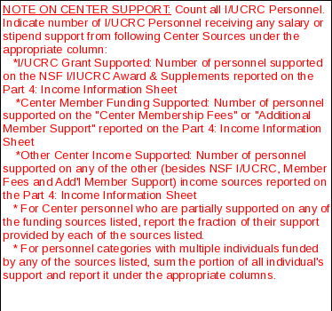 In the green highlighted areas below, please enter Center personnel information. Include individuals who are considered IUCRC personnel by virtue of their being supported by any of the funding sources reported on the Part 4: Income Information Sheet, conducting Center funded research, or using Center facilities. Report personnel counts in each category in whole numbers, regardless of time full- or part-time commitments to the Center. Scroll down for additional categories. Scroll right for partner site data entry. NOTE: If yours is a multi-site center, use the information collected in the 'Partner Site Information Sheet' to enter information separately for each site (SCROLL RIGHT). Numbers will be summed automatically in the columns beneath the blue bar. |
