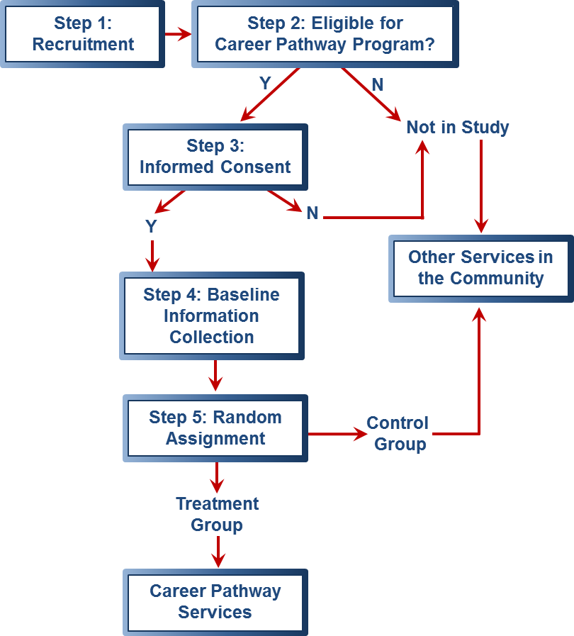 The PACE study recruited programs that had innovative career pathway programs in place and could implement random assignment tests of these programs. Program selection began with conversations between key stakeholders and the PACE research team. Each program selected into PACE satisfied criteria in three categories:
