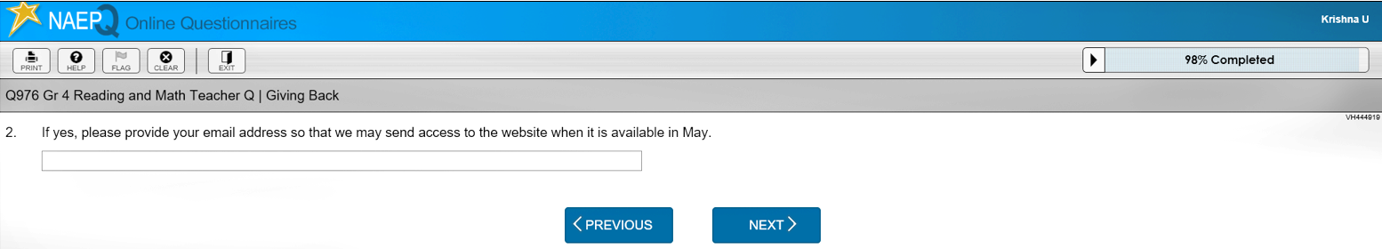 According to the Paperwork Reduction Act of 1995, no persons are required to respond to a collection of information unless it displays a valid OMB control number. The valid OMB control number for this voluntary information collection is 1880-0542. The time required to complete this information collection is estimated to average 90 minutes, including the time to review instructions and complete and review the information collection. If you have any comments concerning the accuracy of the time estimate, suggestions for improving this collection, or any comments or concerns regarding the status of your participation, please write to: National Assessment of Educational Progress (NAEP), National Center for Education Statistics (NCES), Potomac Center Plaza, 550 12th St., SW, 4th floor, Washington, DC 20024.