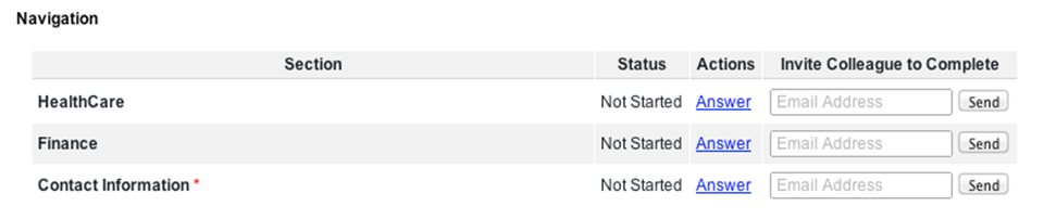 The Section Navigator is particularly critical for the Partner Organization assessment because it will enable the primary points-of-contact to separate the assessment into sections to make it easy for different respondents to complete different parts without interrupting or overwriting one another. Simply stated, the Section Navigator enables one Partner Organization to be completed by multiple people. For example:
