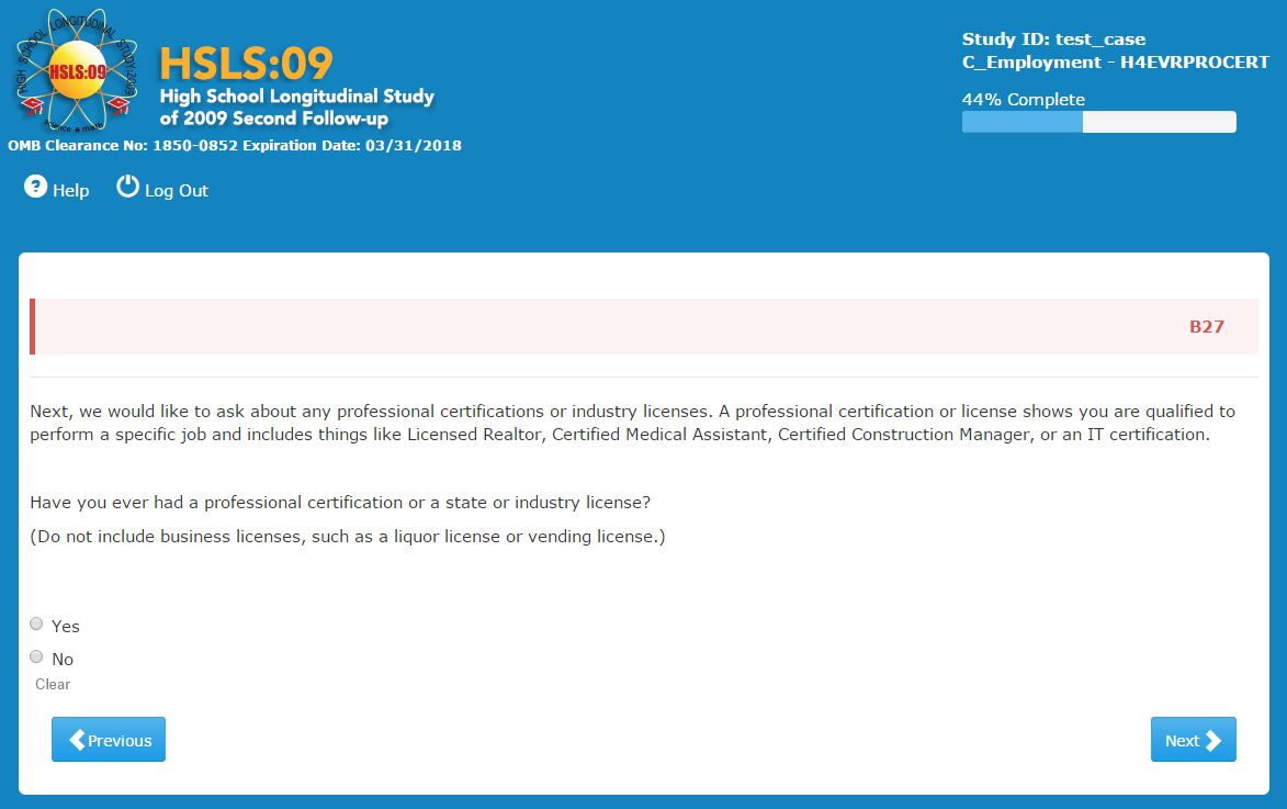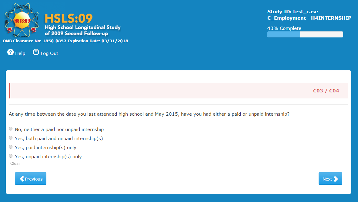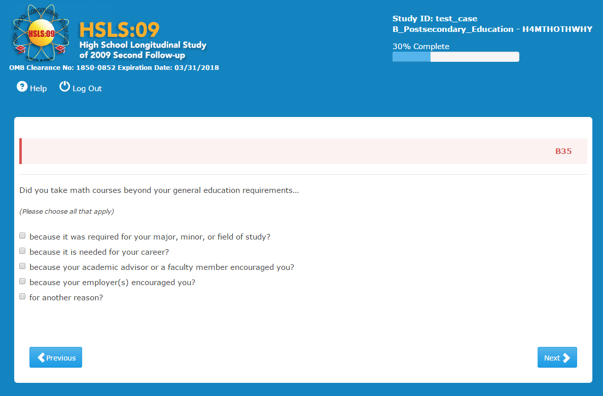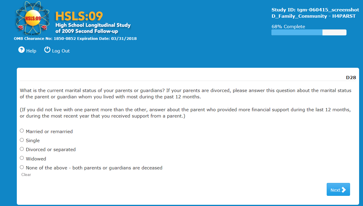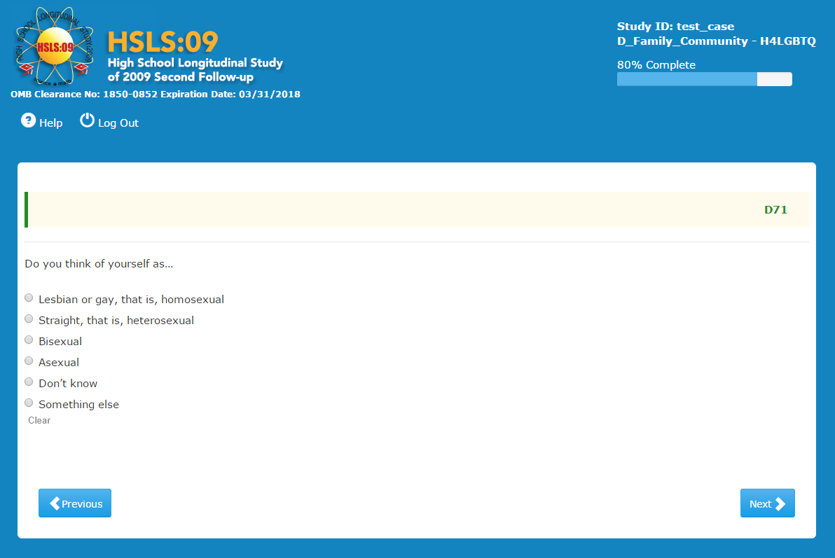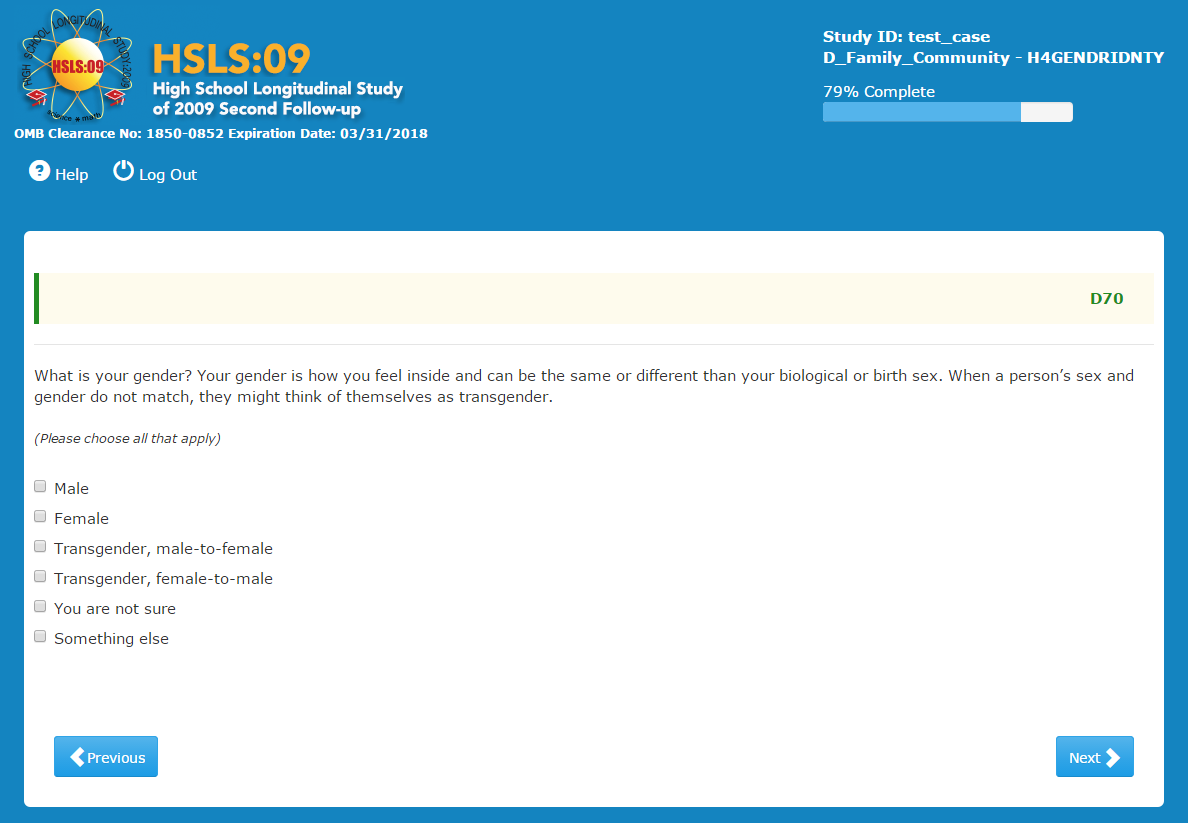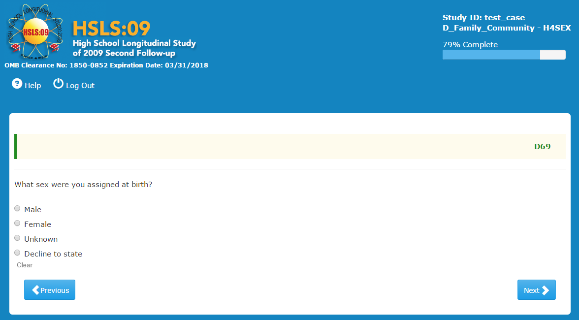 NOTE: D69 has been revised from the second follow-up field test instrument’s version of this question. The parenthetical “(what the doctor put on your birth certificate)” has been removed and response options 3 and 4 have been added. This cognitive interview will test a version that is presented in the Williams Institute Report (Conron et al., 2014). |