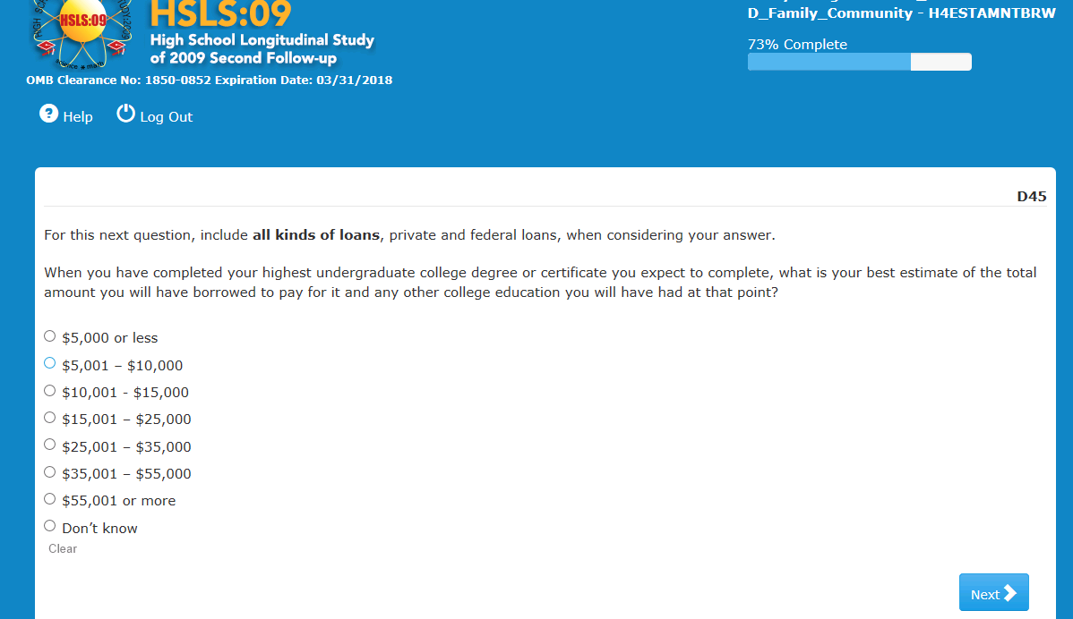 In answering, most respondents were thinking of the types of loans they currently have (or had at graduation time; one respondent has borrowed for her graduate education but had no previous loans for undergraduate). Respondents included federal and other student loans, and appeared comfortable in selecting a range.