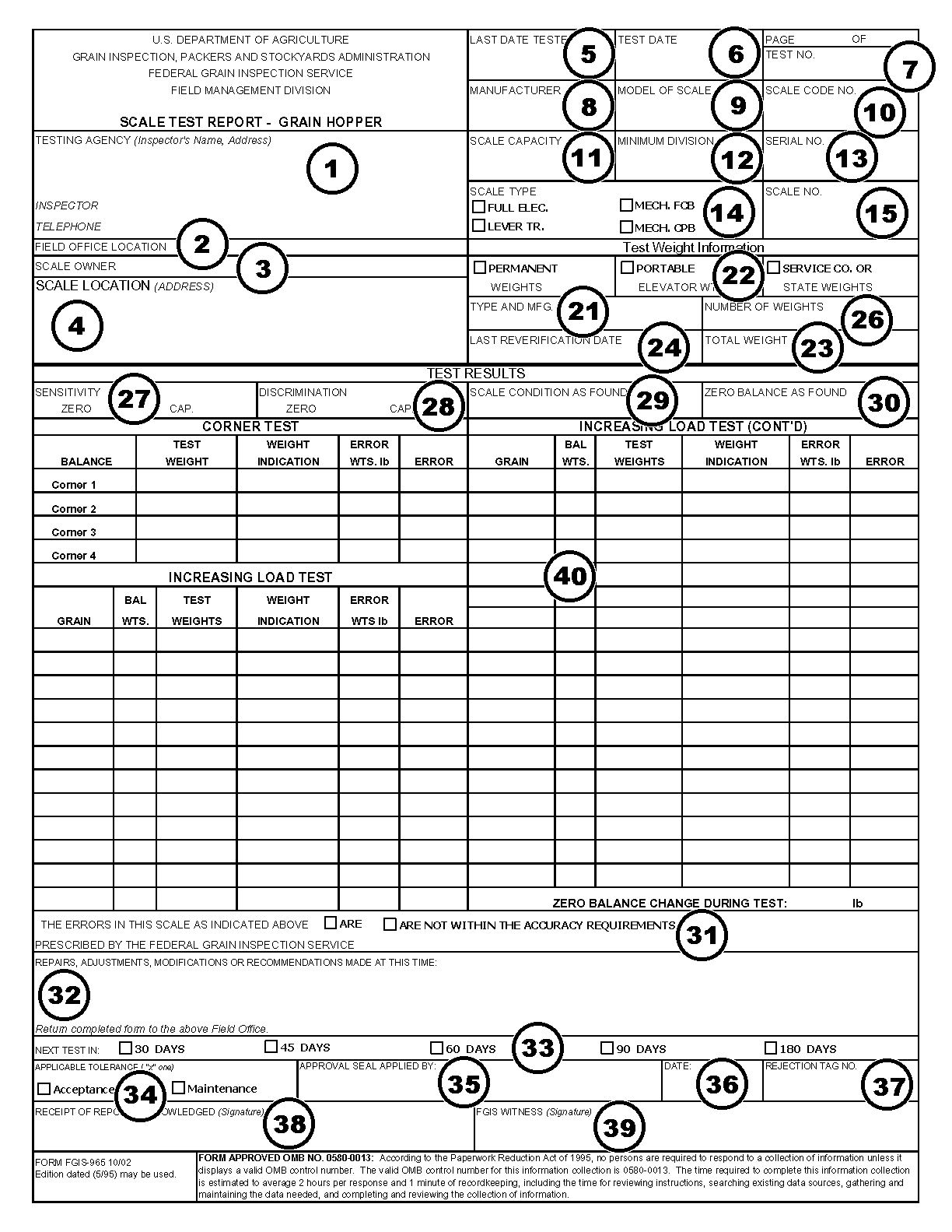 FORM FGIS-965 FEBRUARY 02 FORM APPROVED OMB NO. 0580-0013: According to the Paperwork Reduction Act of 1995, an agency may not conduct or sponsor, and a person is not required to respond to a collection of information unless it displays a valid OMB control number. The valid OMB control number for this information collection is 0580-0013. The time required to complete this information collection is estimated to average 2 hours per response and 1 minute of recordkeeping, including the time for reviewing instructions, searching existing data sources, gathering and maintaining the data needed, and completing and reviewing the collection of information.