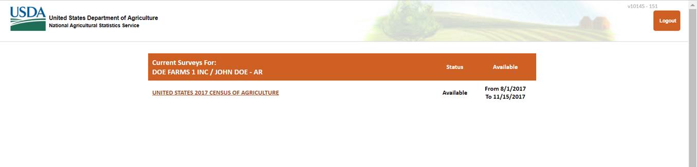 List of Available surveys: Once the respondent has logged into the system this screen will appear and tell the respondent which surveys they can complete.