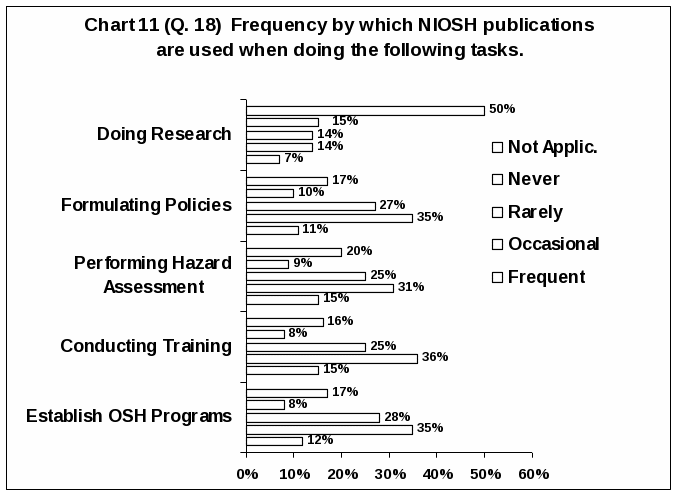 Forty-nine percent of the survey participants indicated that NIOSH publications had been “referred to or cited by name” in their “organizations’ policy and procedures,” whereas 30% indicated they had not been cited, 17% did not know and 4% did not apply. (Q. #19)