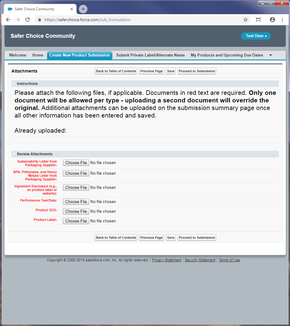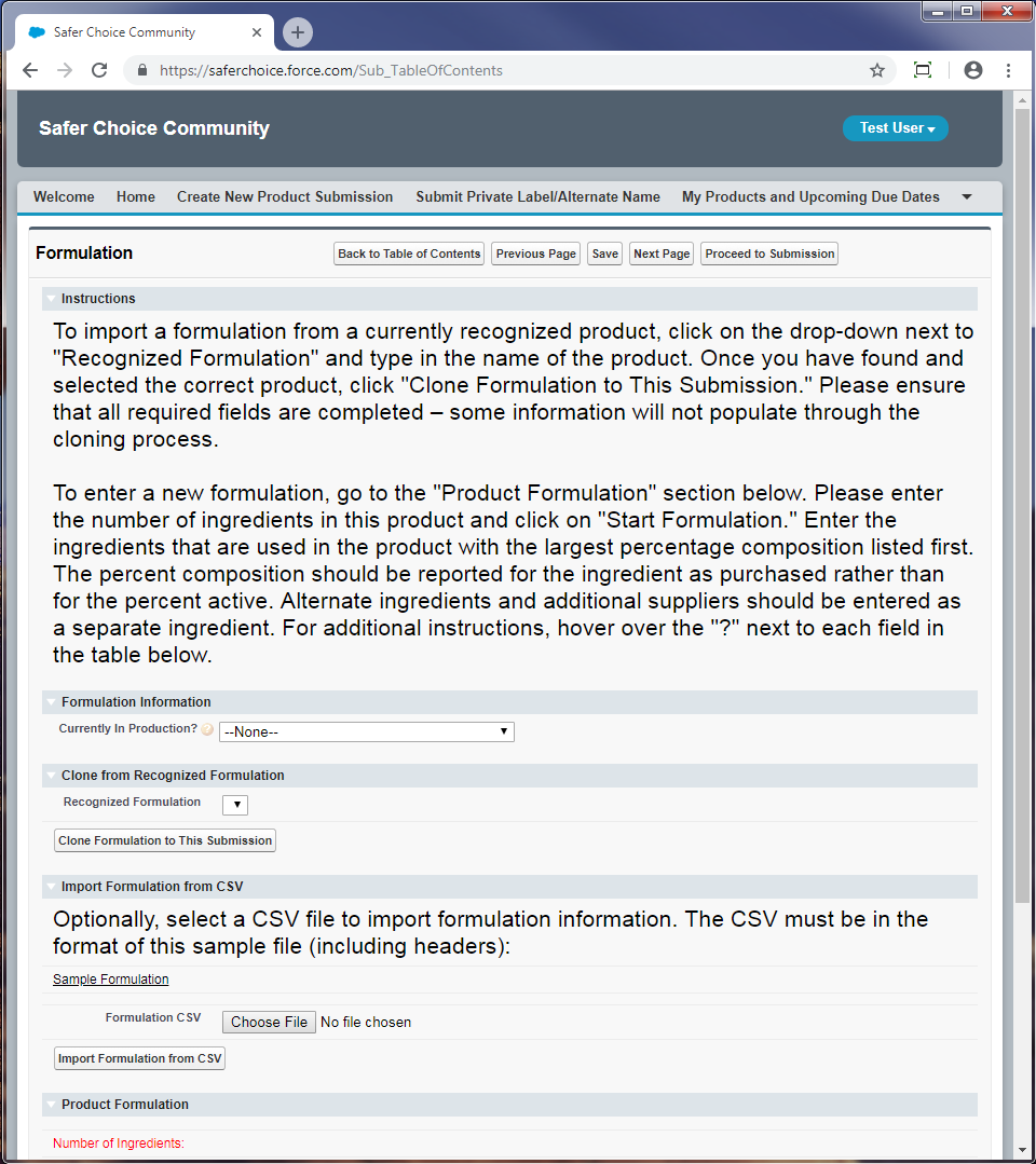 Following are screenshots from the Product and Ingredient Submission forms in Safer Choice’s Salesforce data system. Note that the specific details of the screenshots may change over time as the Safer Choice program improves and/or modifies the system. However, the general and fundamental components of the Salesforce system will be similar to what is presented in the following screenshots.