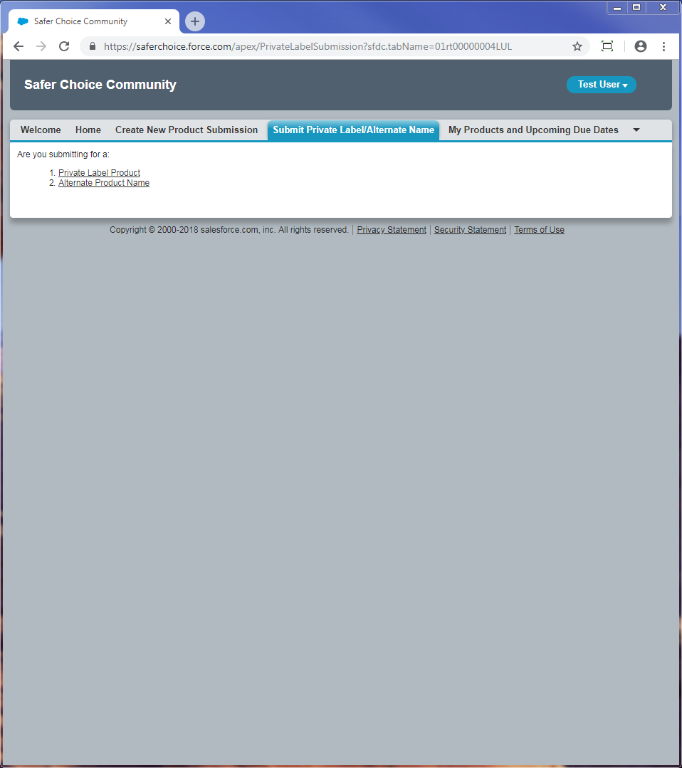 Following are screenshots from the Form for Adding Third-Party Partners and Products (referred to as Submit Private Label/Alternate Name) in Safer Choice’s Salesforce data system. Note that the specific details of the screenshots may change over time as the Safer Choice program improves and/or modifies the system. However, the general and fundamental components of the Salesforce system will be similar to what is presented in the following screenshots.