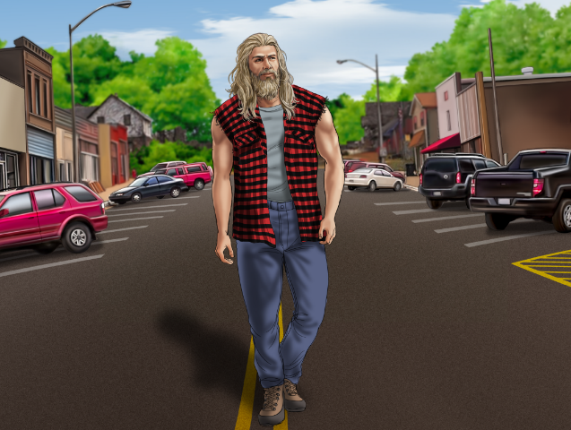 NARRATOR: This commercial tells the story of Big Tim Timberfist — a massive mountain of a man, strong and tough. First we see him stride through the town with an intimidating swagger. A country singer playing guitar stands by the side of the road and sings big Tim’s theme song.
