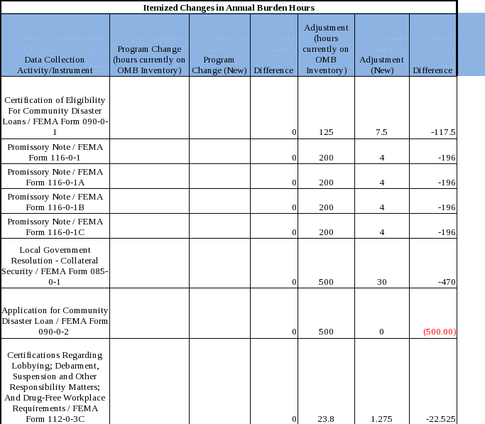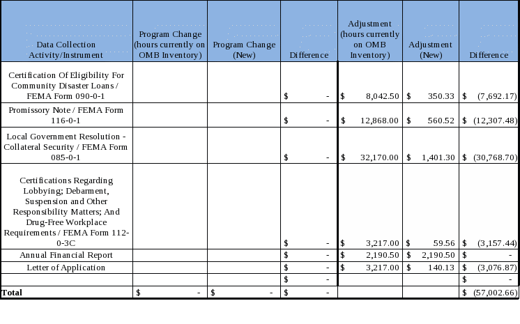 The government cost difference of $57,002.66 is a decrease caused by reducing the expected 50 applicants from the previous approval to three, including an increase of $59.56 due to addition of the Certification Regarding Lobbying; Debarment, Suspension and Other Responsibility Matters; and Drug-Free Workplace Requirements/FEMA Form 112-0-3C. This is a decrease in cost from the previous OMB Inventory based on new wage rates, reduction in respondents, adoption of one form and one less burden (removal of Application for Community Disaster Loan / FEMA Form 090-0-2).