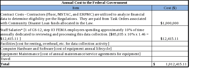 Estimated annual cost to the Federal government totals $1,012,415.11 allocated between FEMA staff spending approximately 10% of their time involved in collection-related activities for ($85,035 x 10% x 1.46 = $12,415.11) and contractor expenses ($60,000 at $20,000 per week). Contract funding comes from a congressional appropriation which has averaged $1,000,000 to administer 3 loans. FEMA staff oversight of contractor activities is directly related to the collection and included in the estimated cost to the Federal Government. The assumption being 3 loans, 25 weeks’ worth of work, and one (1) loan completed by a single contractor per week and one (1) FEMA staff member overseeing operations per week. In total, it will take 25 weeks’ worth of contractors to complete with FEMA oversight lasting approximately 5 weeks.