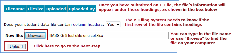 We need to know what information is in each column of your student data file (E-File). If you provided column headers in your E-File (preferred), they are displayed in Column Heading Is in the table. If you did not provide column headers, Column Heading Is will contain numbers for each column in your submitted E-File. Click on the down arrows in Your Column Contains to select descriptions for each column header. If there is no appropriate description in the drop-down list, please select N/A.