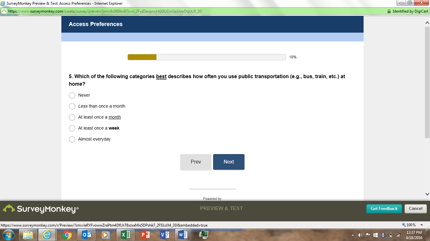 Hope requested that we better define "Hardly Ever" as listed in the original approved question. This category is expected to represent riders who know how to use transit, but rarely do. We also underlined month and bolded week to ease the burden on the respondent by more clearly conveying that they were different time frames (month vs. week)