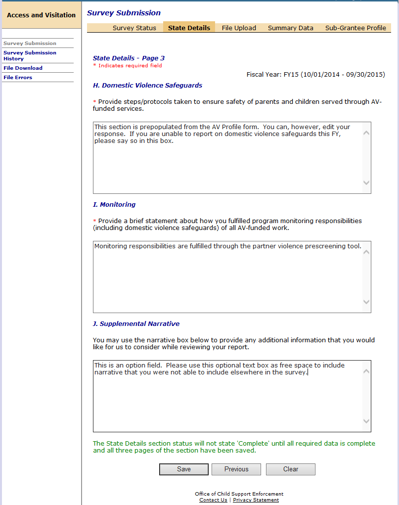 • The Domestic Violence Safeguards textbox is the only section on the Summary Data page that pre-populates based on the data entered in field H on State Details page 2. To make changes to the Domestic Violence Safeguards text box, click the State Details tab and edit field H. Save the changes. The Summary Data section will reflect these changes.